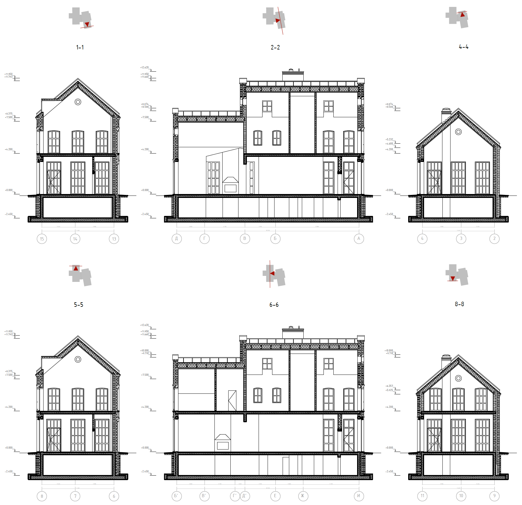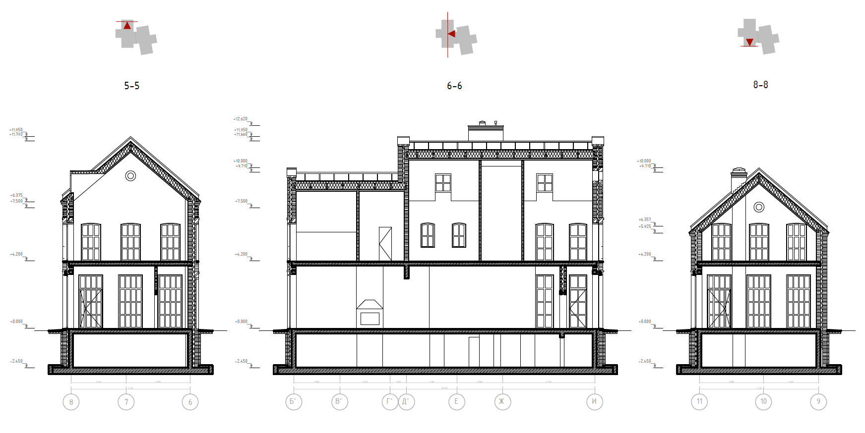 Корпус №8.1-8.12. Тип 2. Разрезы 5-5, 6-6, 8-8 М 1:150