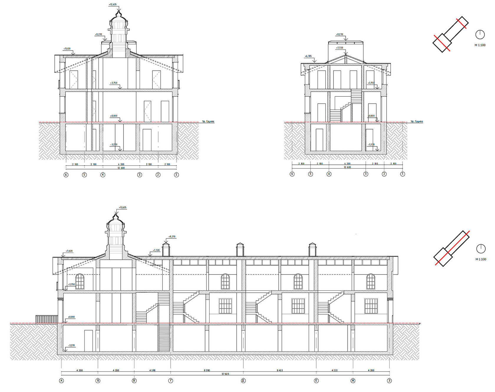 Корпус №8.1-8.12. Тип 3. Разрезы 1-1, 2-2, 3-3 М 1:150