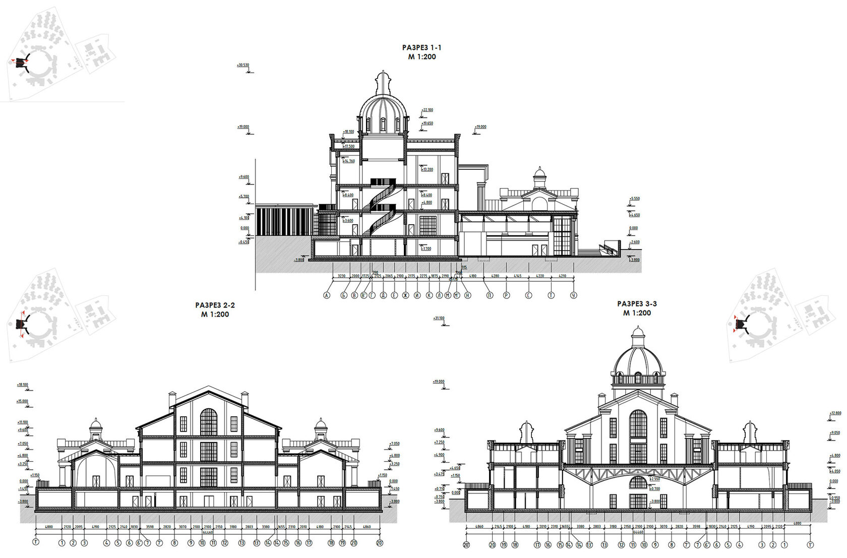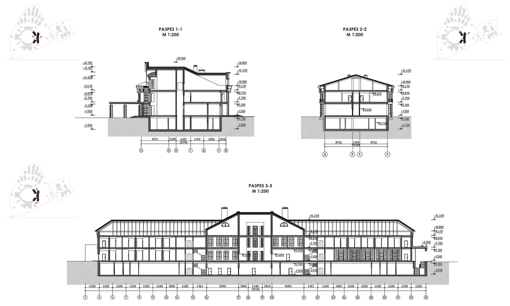 Building No. 3. Section 1-1, Section 2-2, Section 3-3 M 1:200