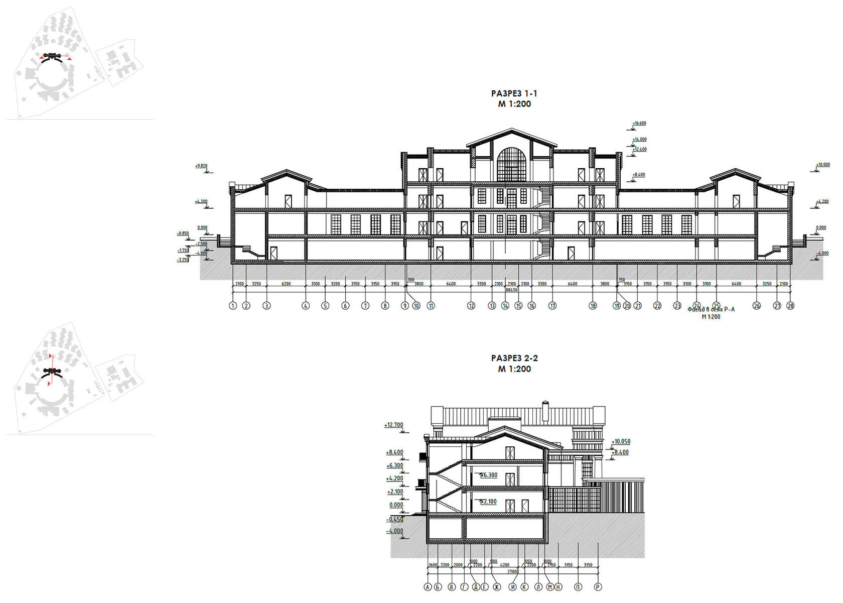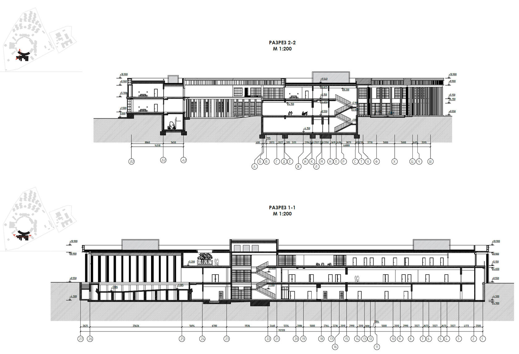 Building No.2. Section 1-1 scale 1:200, Section 2-2 scale 1:200