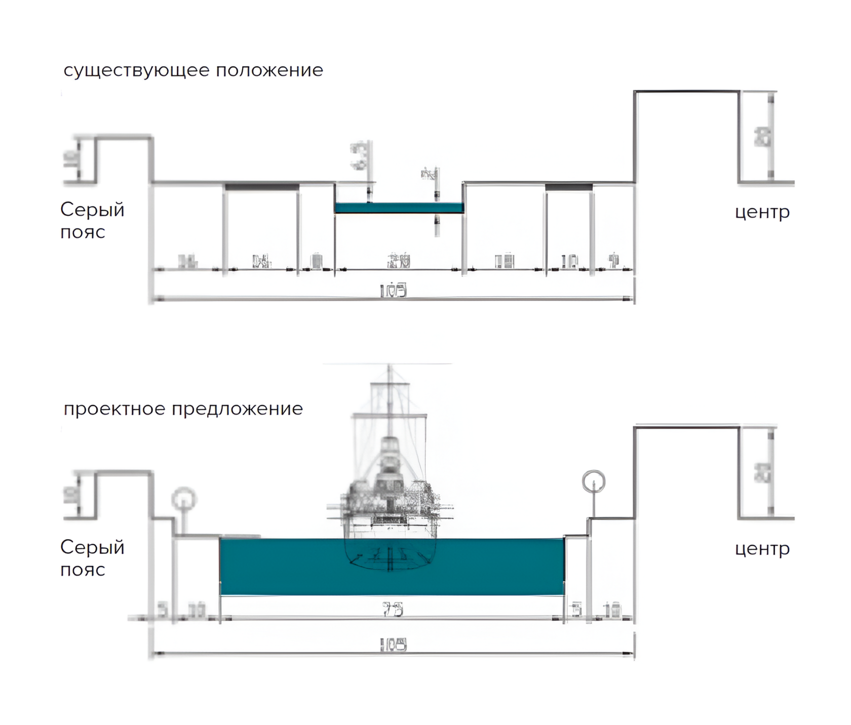 Also, the streetcar stop and the main entrance from Livlanda Street should be relocated. In order to unite the two parts of the park, which are cut off from each other today, it is necessary to reconsider the attitude towards Livlyadskaya Street. It is proposed to close off through car traffic on weekends and organize temporary parking for park visitors.