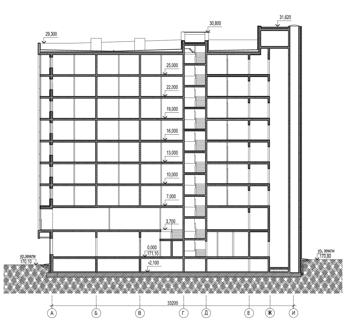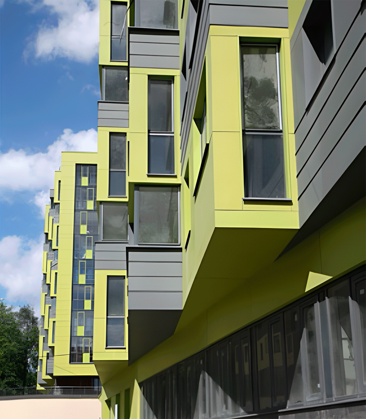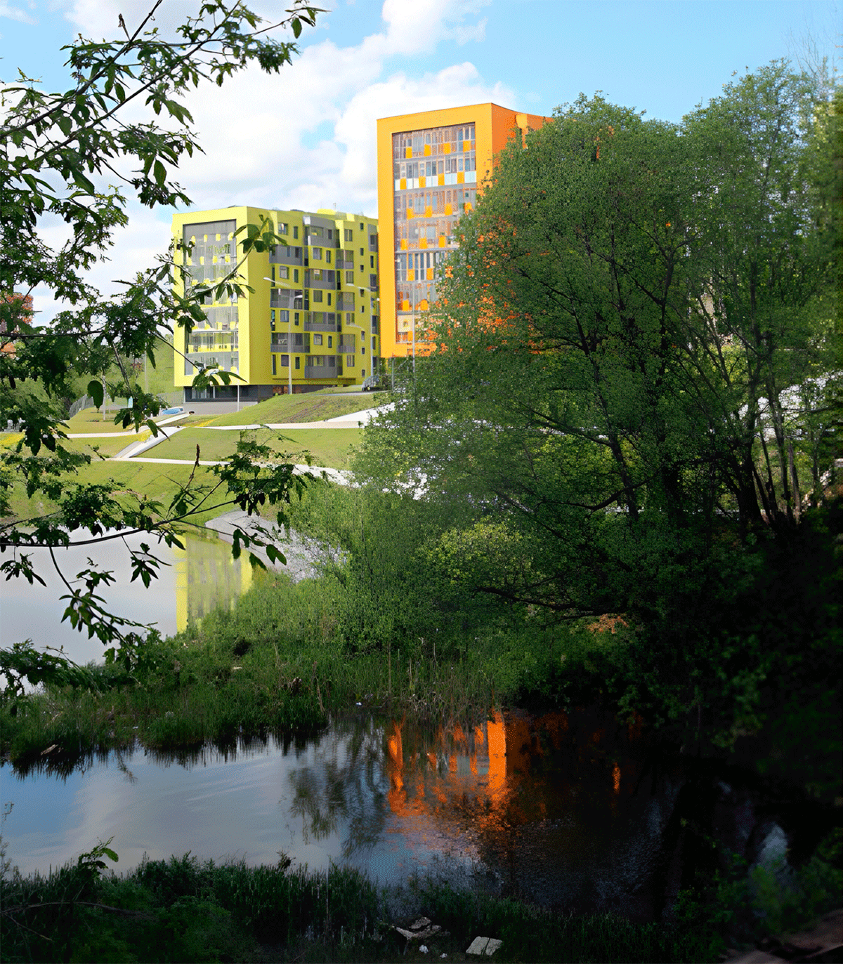 Участок расположен на склоне реки, перепад рельефа с севера на юг порядка 18 метров. Генеральный план и планировочная структура зданий решены таким образом, чтобы из каждой квартиры открывался вид на реку. Задачей заказчика было вписаться в бюджет 40 тыс. рублей за квадратный метр, включая не только сами здания, но и подземный паркинг, благоустройство территории с инженерной инфраструктурой, что примерно соответствует стоимости привязки типовых панельных домов.