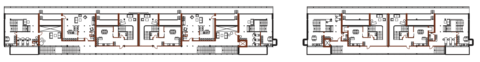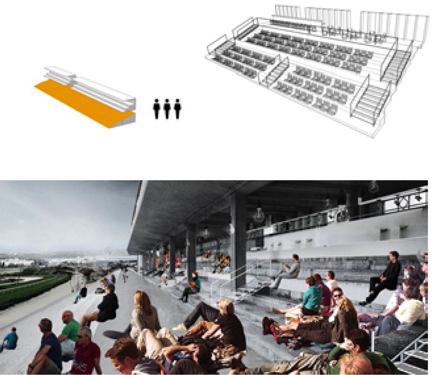 Due to the extension of the existing underground line U2, the area, which combines residential and office functions and which is located between the football stadium, the Vienna University campus and the horse race track Krieau Wiener Trabrennverein, is actively developing nowadays. The objective of the project was to reconstruct two seating stands of the Krieau hippodrome, which was built in 1910. The task was to think through a plan of residential or office use of the existing structures and to allocate at least 50% of the first-floor space in each building for public use. Despite the fact that all the currently available facilities have already been provided with public infrastructure, this young community does not have its own unique center of attraction. The main idea was to turn the main space of the stands into a multifunctional area. With this aim in view, the stands were extended to ground level and equipped with a ramp.