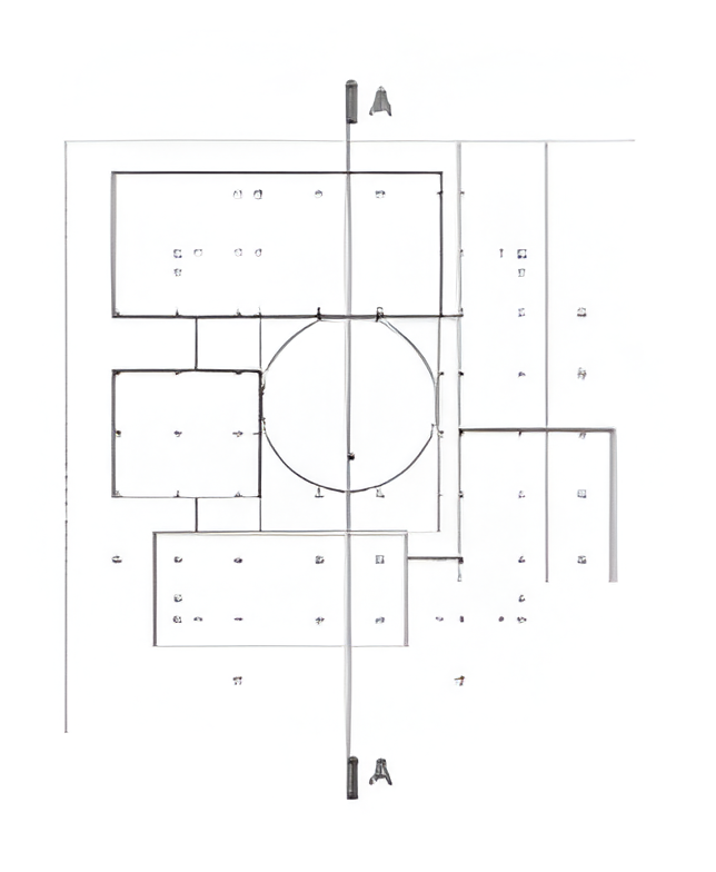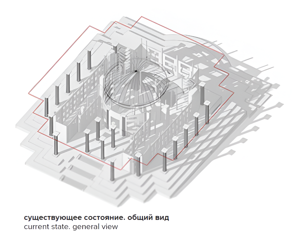 After analyzing the existing building, its structural design and the surrounding context, it was decided to dismantle all existing non-bearing elements and the dome, leaving the entire structural frame and roof. This avoided the overloaded, disproportionate and heavy image of the existing building. After dismantling, the main element left is the flat roof soaring above the park, which is held up by dozens of thin columns. The dismantling of the dome resulted in a circular hole in the roof.