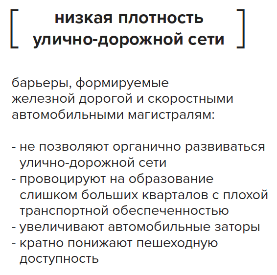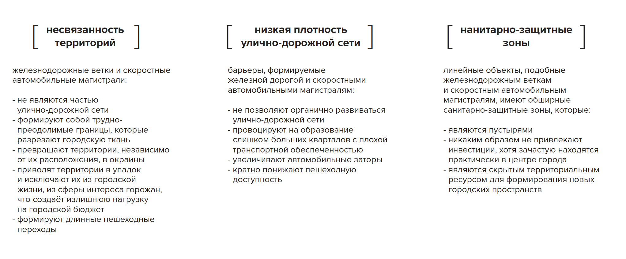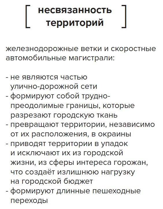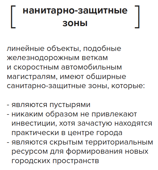 Railroad tracks and high-speed highways create negative factors hindering the development of adjacent territories, multiply reducing the quality of the urban environment