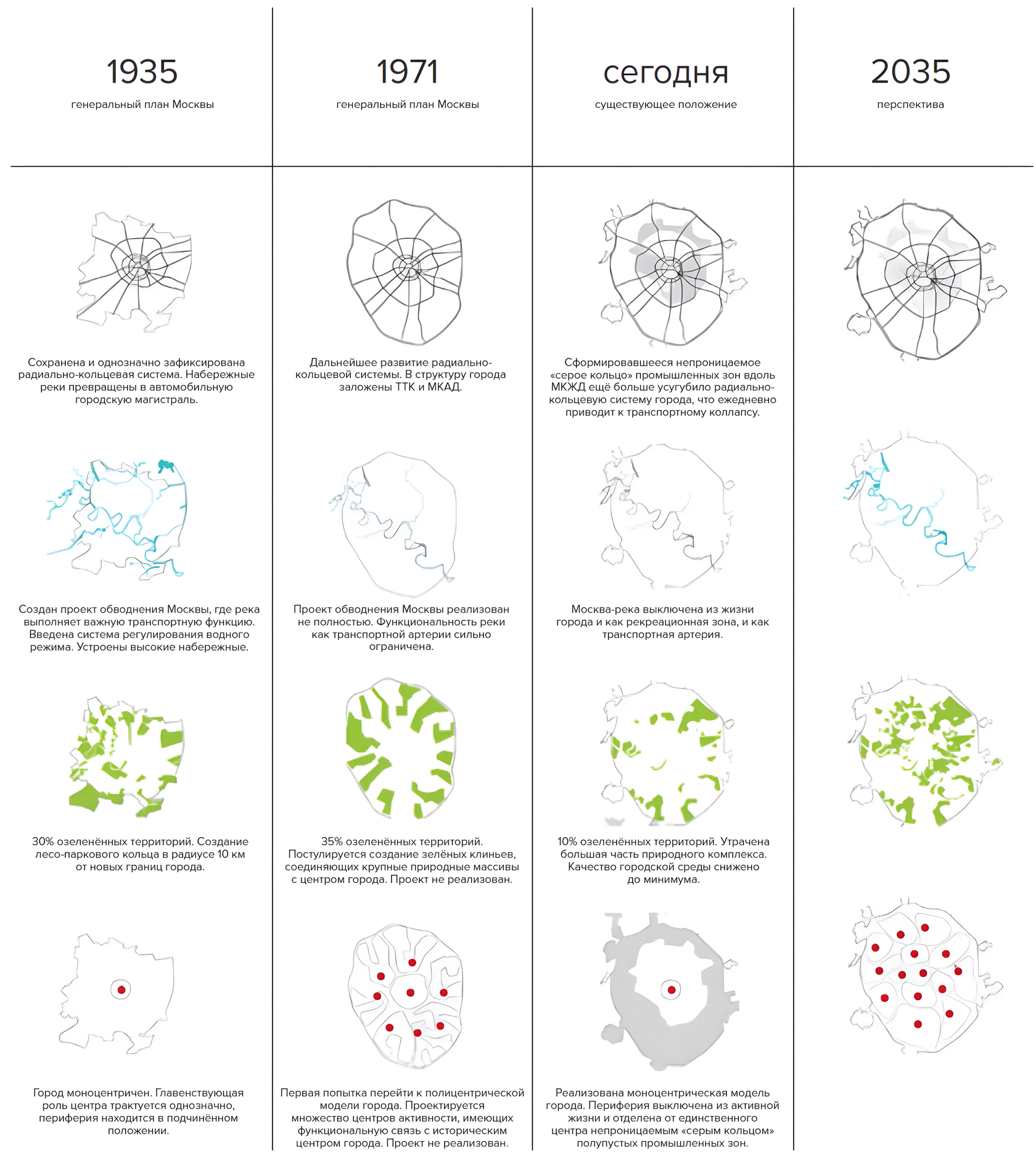 Проект посвящён столетию генплана Москвы. Проектирование велось в направлениях развития зелёного экологического каркаса, развития транспорта и пешеходных путей, развития водной инфраструктуры, а также отказа от моноцентричности в пользу полицентричного города, дающего человеку выбор, а не навязывающего ему жёсткие правила не вполне комфортной жизни.