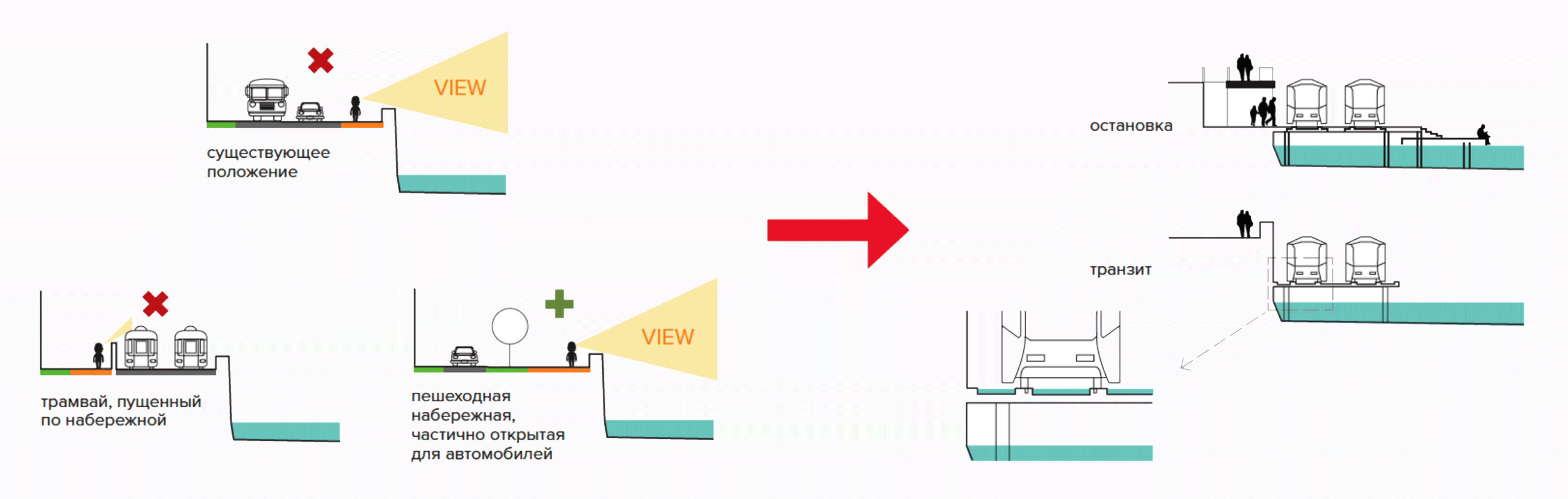 Второй проблемой, вытекающей из-за отсутствия связей, является низкая функциональная насыщенность территорий набережных. Когда прибрежные территории, причалы, пространства под мостами, вместо барьеров пешеходным потокам станут узловыми точками, на пересечении общественного водного и наземного транспорта — тогда они же станут центрами культурной и общественной активности, местами проведения культурных событий, выставок. Тогда общественная городская активность начнёт взаимодействовать с рекой.