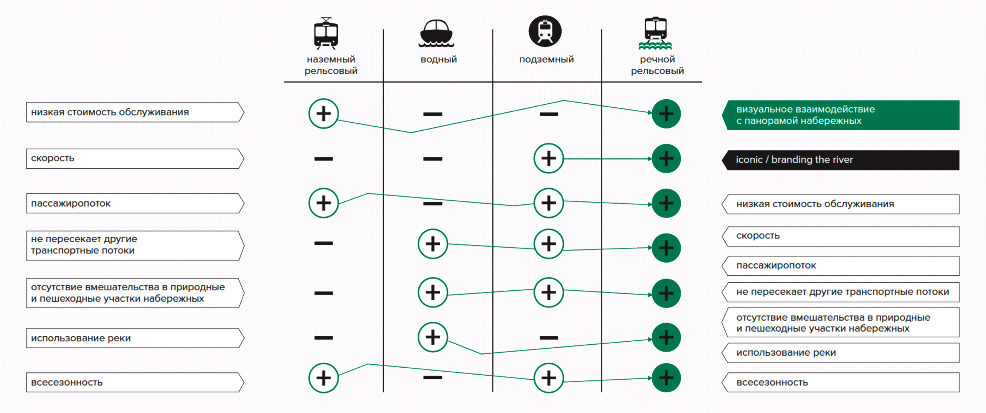 Today, the central part of the Moskva River embankments is largely excluded from the life of the city. The main stops of transportation links are located in remote access from the embankments, thus hindering the development of the urban environment. In this regard, the emergence of new ways of crossing the river and movement along it could cause active development of the coastal territories. For this purpose, new pedestrian routes with ferry crossings are being created, which would reduce long detours and create a more comfortable human environment.