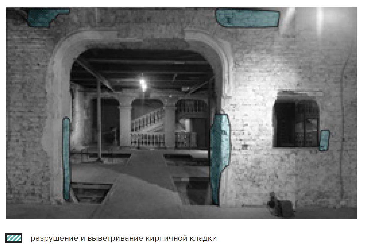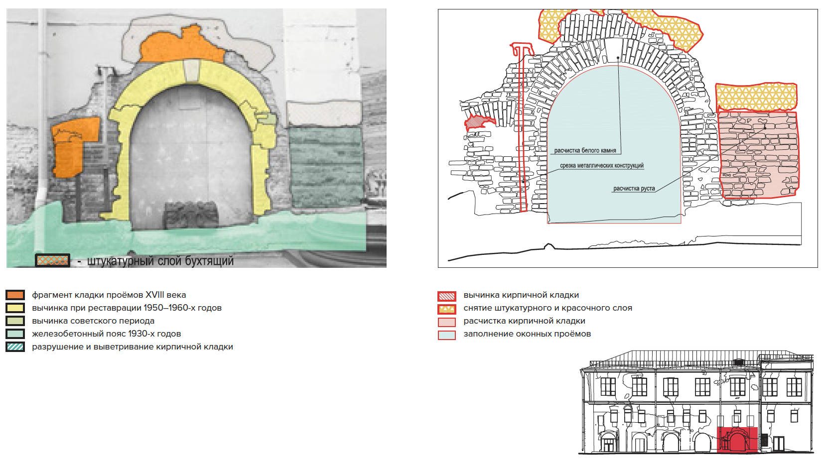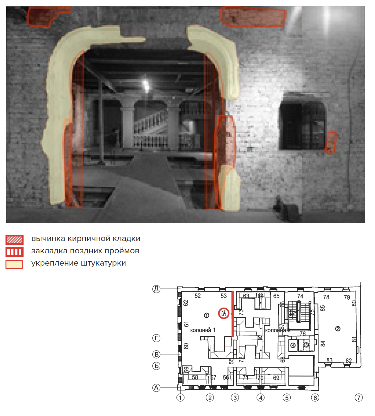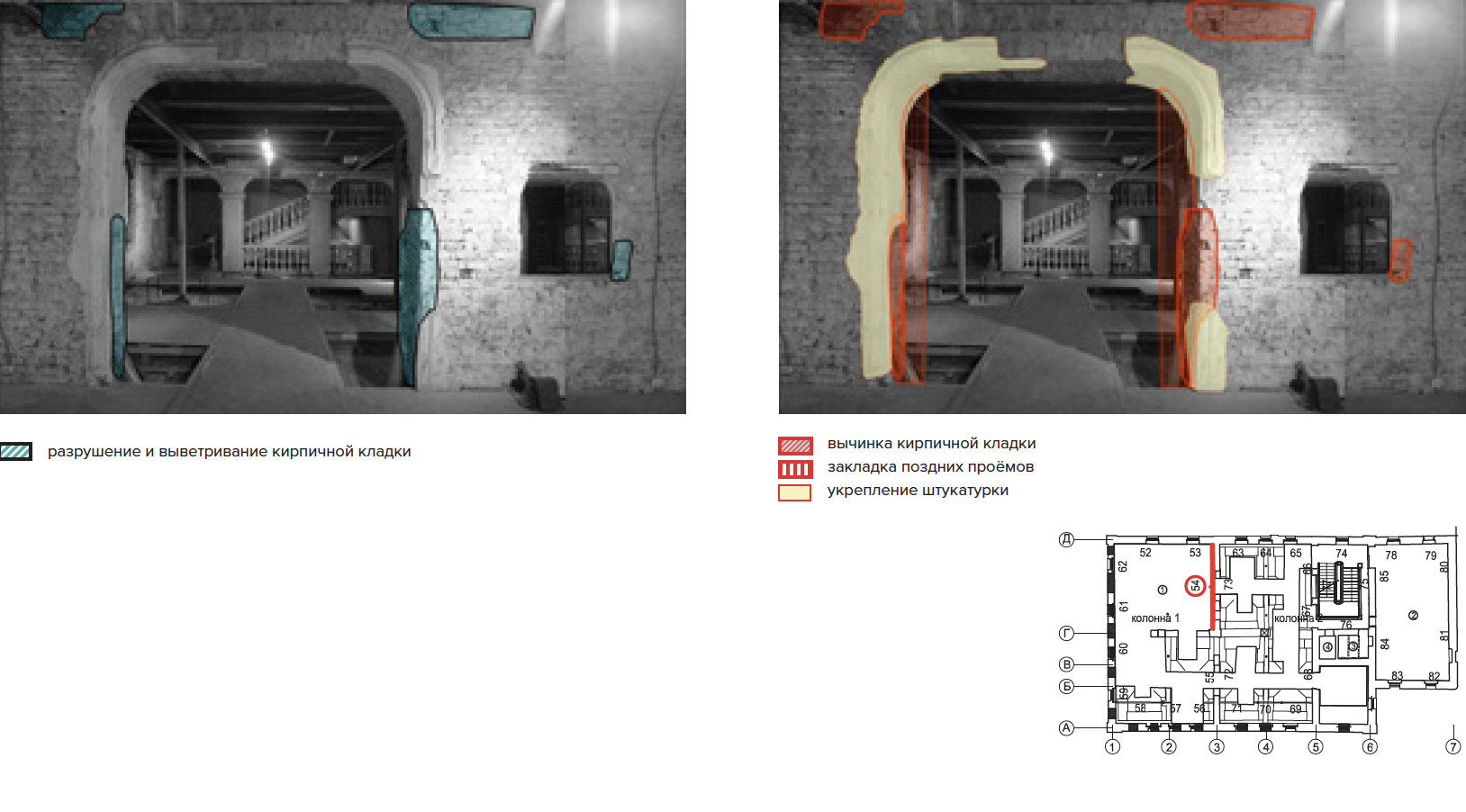 Фрагмент 54 (план 2-го этажа); сверху вниз: картограмма дефектов, рекомендации по противоаварийным и консервационным работам