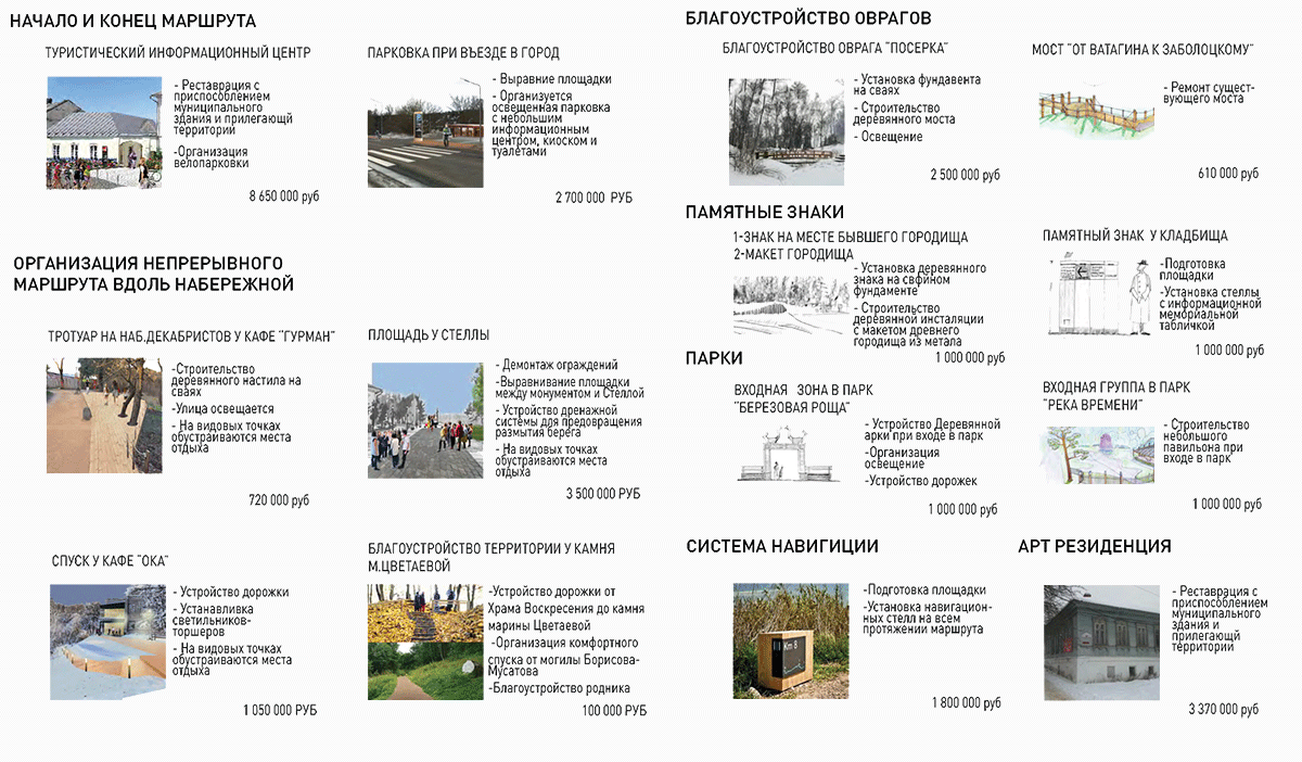 The entrance to the city requires improvement, as it is the first thing a person sees when approaching Tarusa. It is important to organize a parking place for tourist buses and private vehicles in order to relieve the pressure on the historical center of the city. You can leave your car here and follow the signs to the beginning of the route.