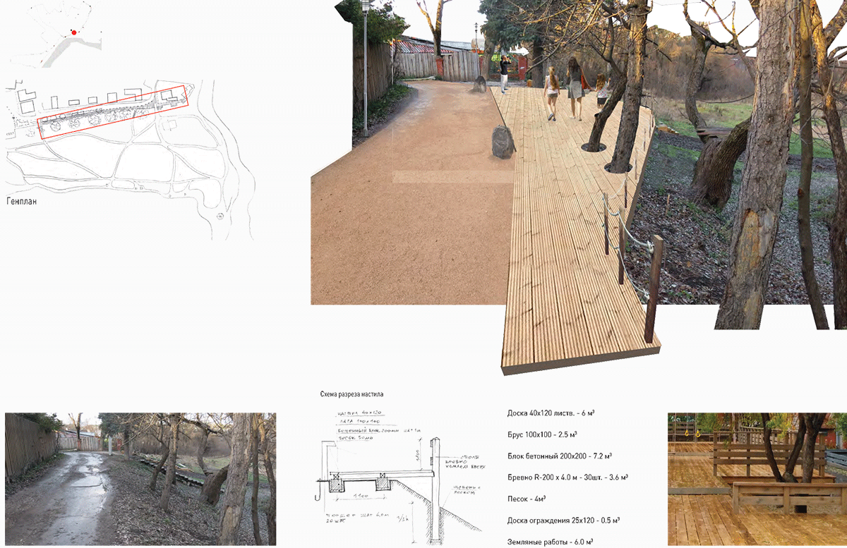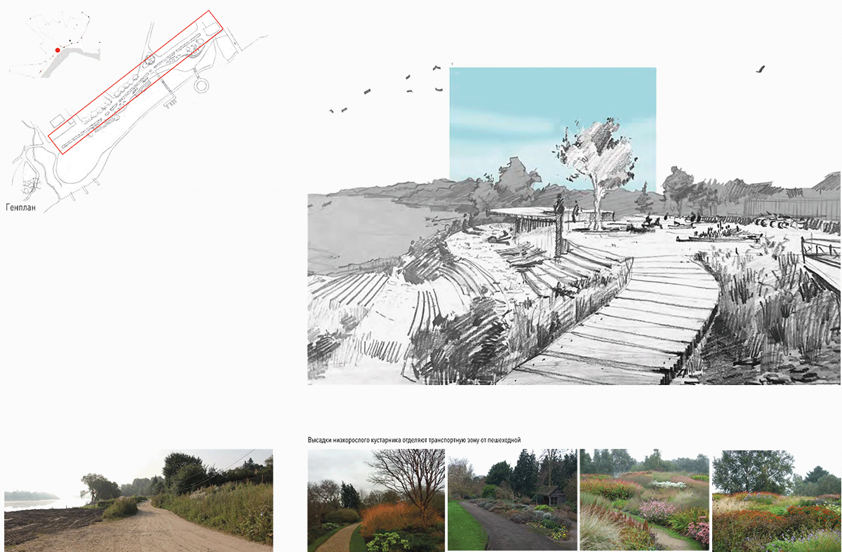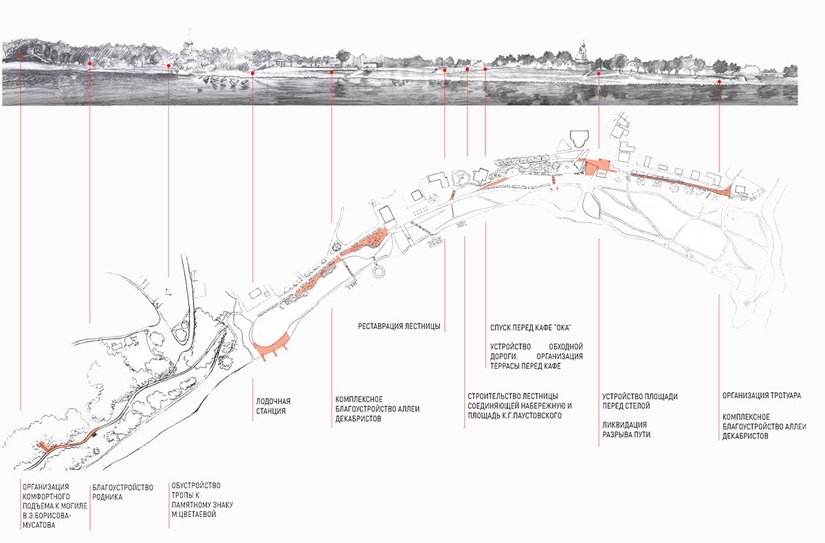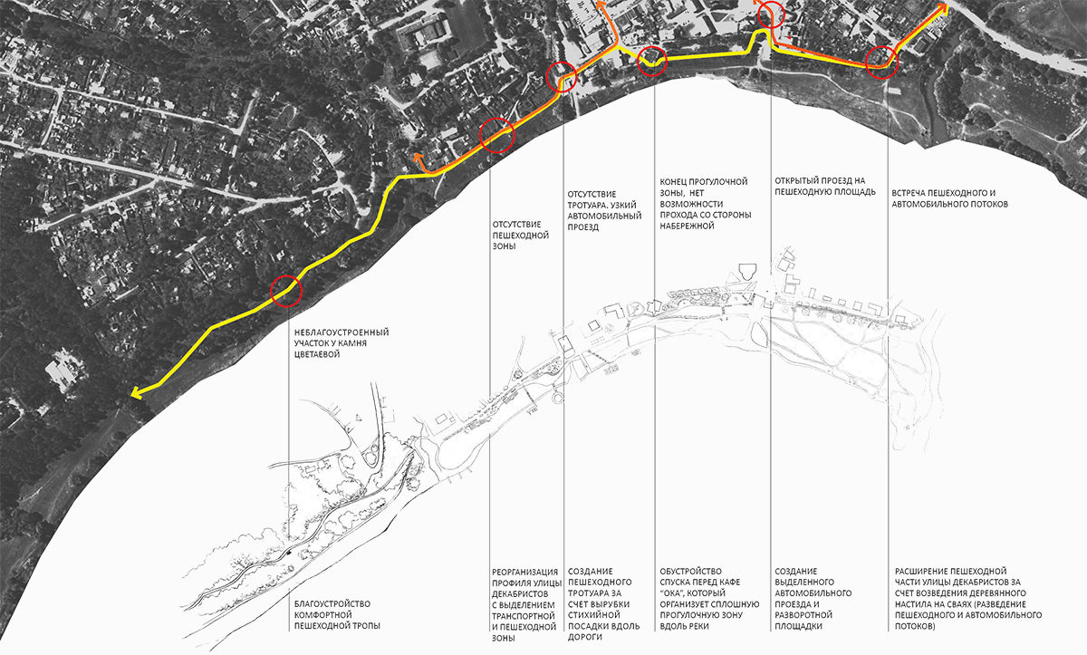 Continuity of the pedestrian route along the embankment at the “Sail” cafe is restored by reorganizing the profile of Dekabristov Street with the separation of transport and pedestrian zone.