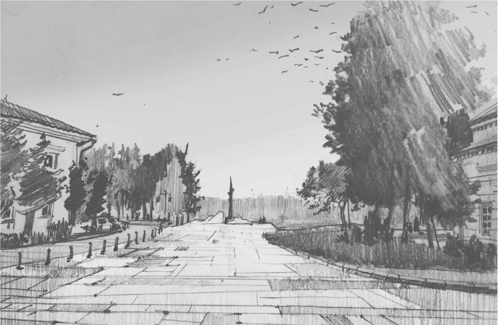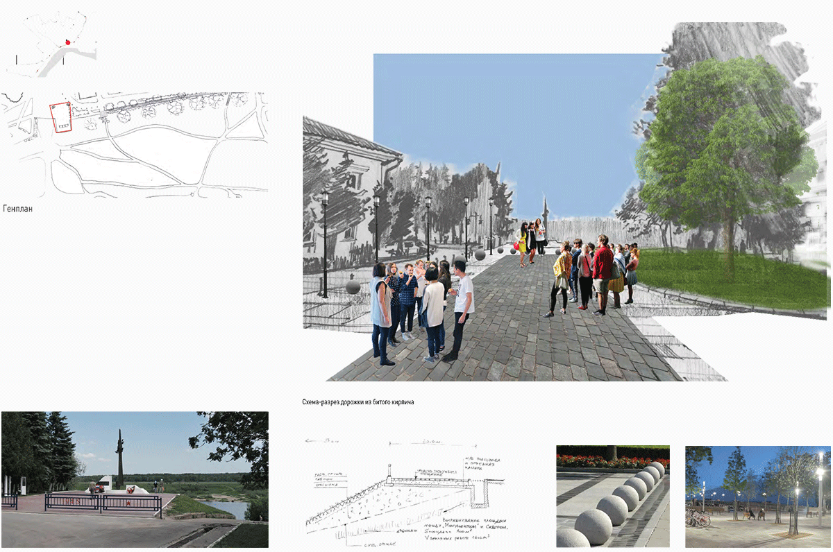 For continuity of routes, we propose to remove the fences restricting the memorial and thus connect the pedestrian breaks of the embankment. Separation of pedestrian and car flows to prevent cars from entering the main square. The descent to the river next to the Stela is closed to car traffic, thus preserving the unique landscape of the water protection zone.