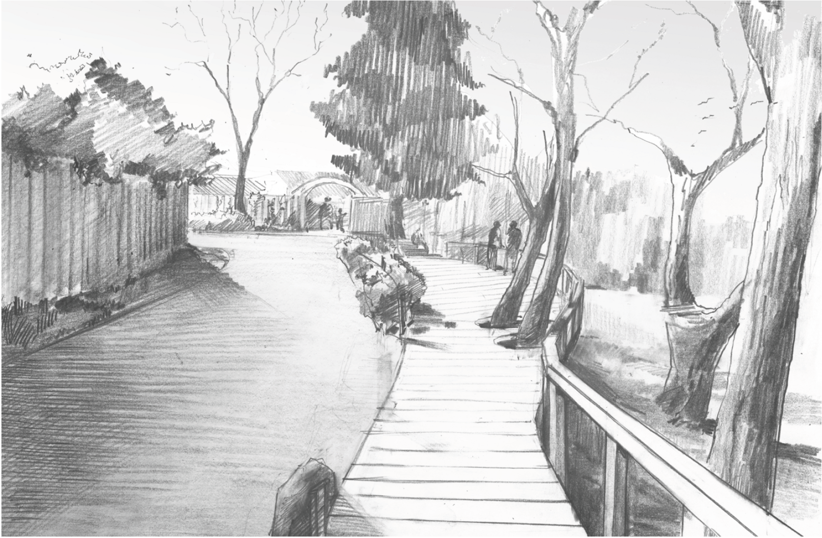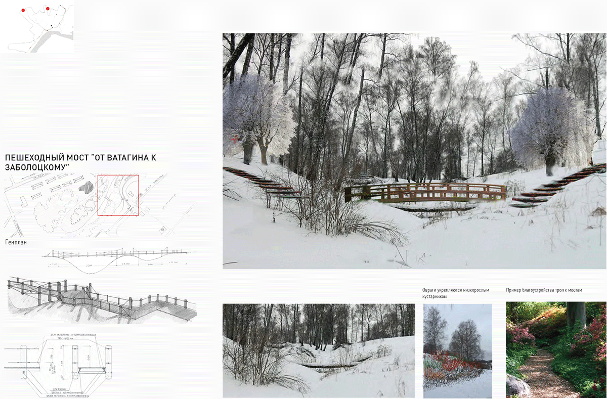 The organization of paths, stairs and bridges over ravines is proposed to create a coherent and comfortable pedestrian route.