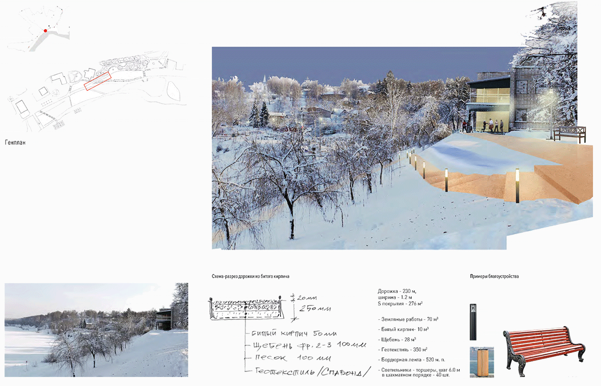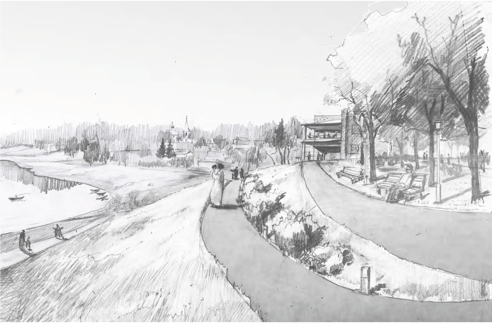 The descent links the previously broken pedestrian path along the embankment into one continuous route. The cafe acquires a comfortable and cozy place to relax overlooking the river.