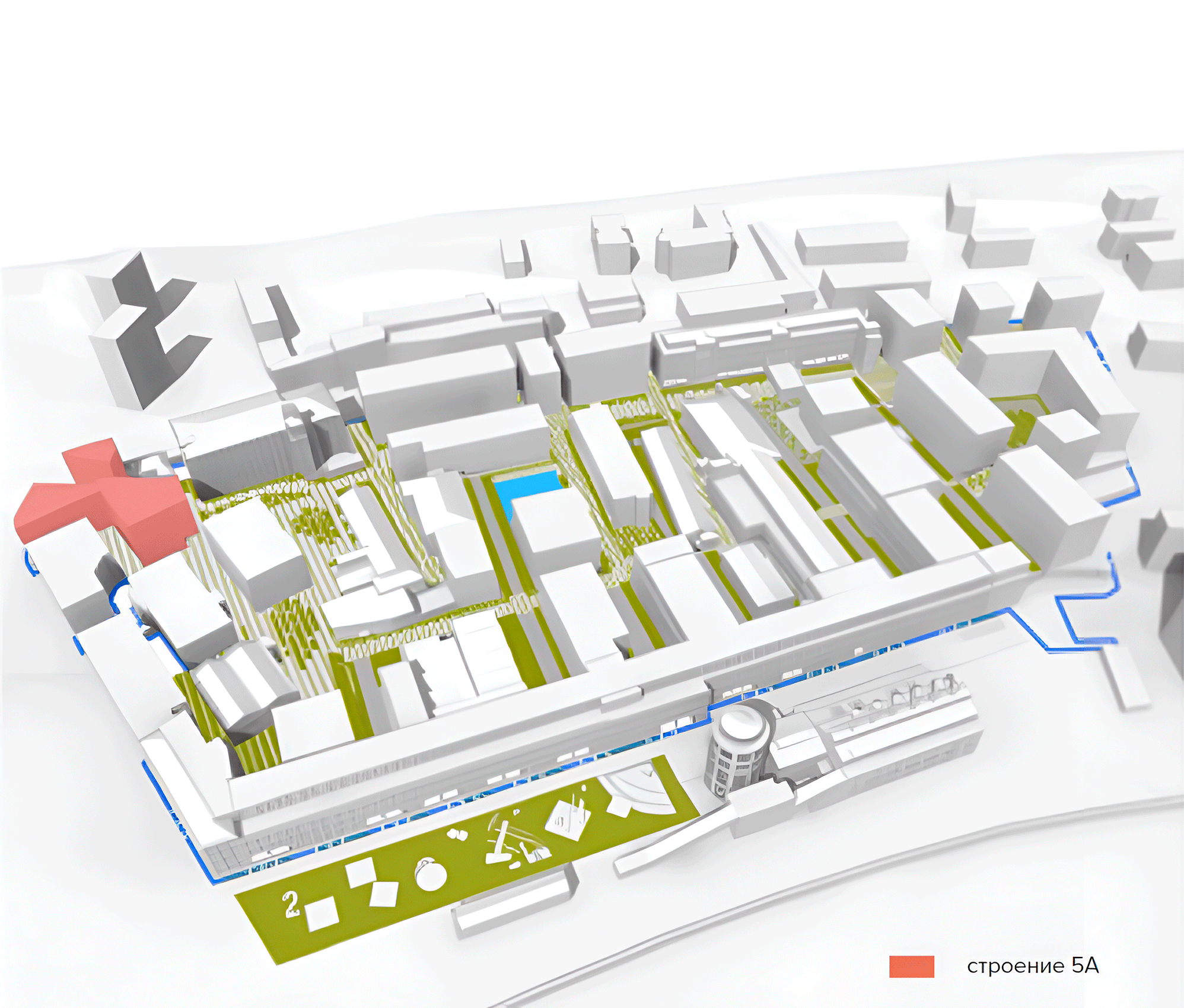 Торгово-выставочный комплекс, состоящий из двух отдельно стоящих объёмов, оформляет главный вход на территорию Трёхгорной мануфактуры и задаёт направление движения посетителей комплекса. В большем первом корпусе на трёх этажах размещаются торгово-выставочные площади, на четвёртом — ресторан. В меньшем корпусе располагается музей, посвящённый истории Трёхгорной мануфактуры. Образ зданий имеет отсылку к ткацкому производству. Узкие вертикальные проёмы с увеличением проёмов книзу создают ассоциацию с видом ткацкого станка в процессе плетения ткани сверху вниз.